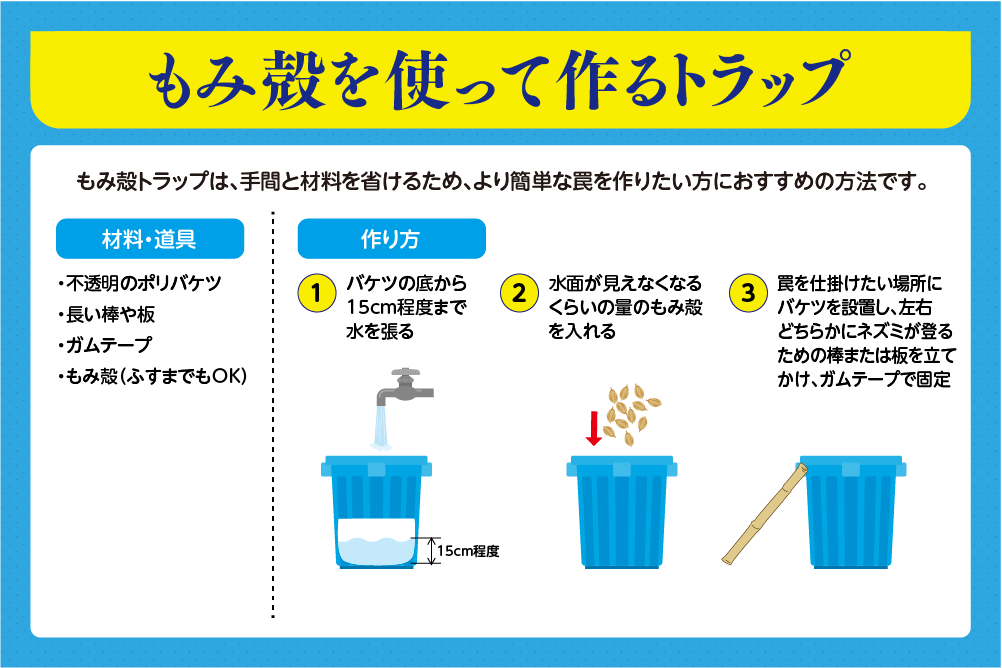 けがや誤食を避けたい場合はペットボトルやもみ殻を使ったトラップを選択することになりますが、ネズミの橋代わりになる板や棒を倒されたり、バケツをひっくり返されたりするリスクもあるでしょう。